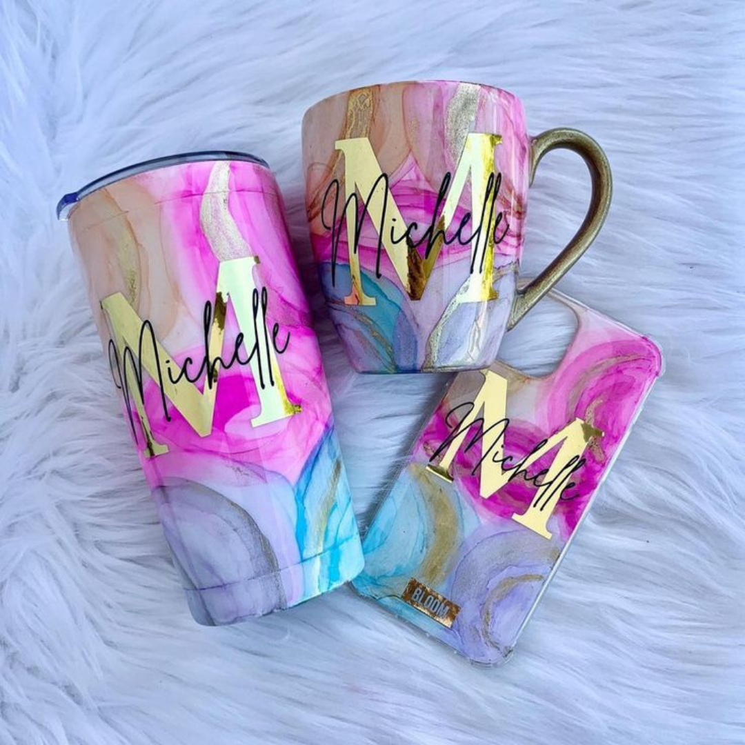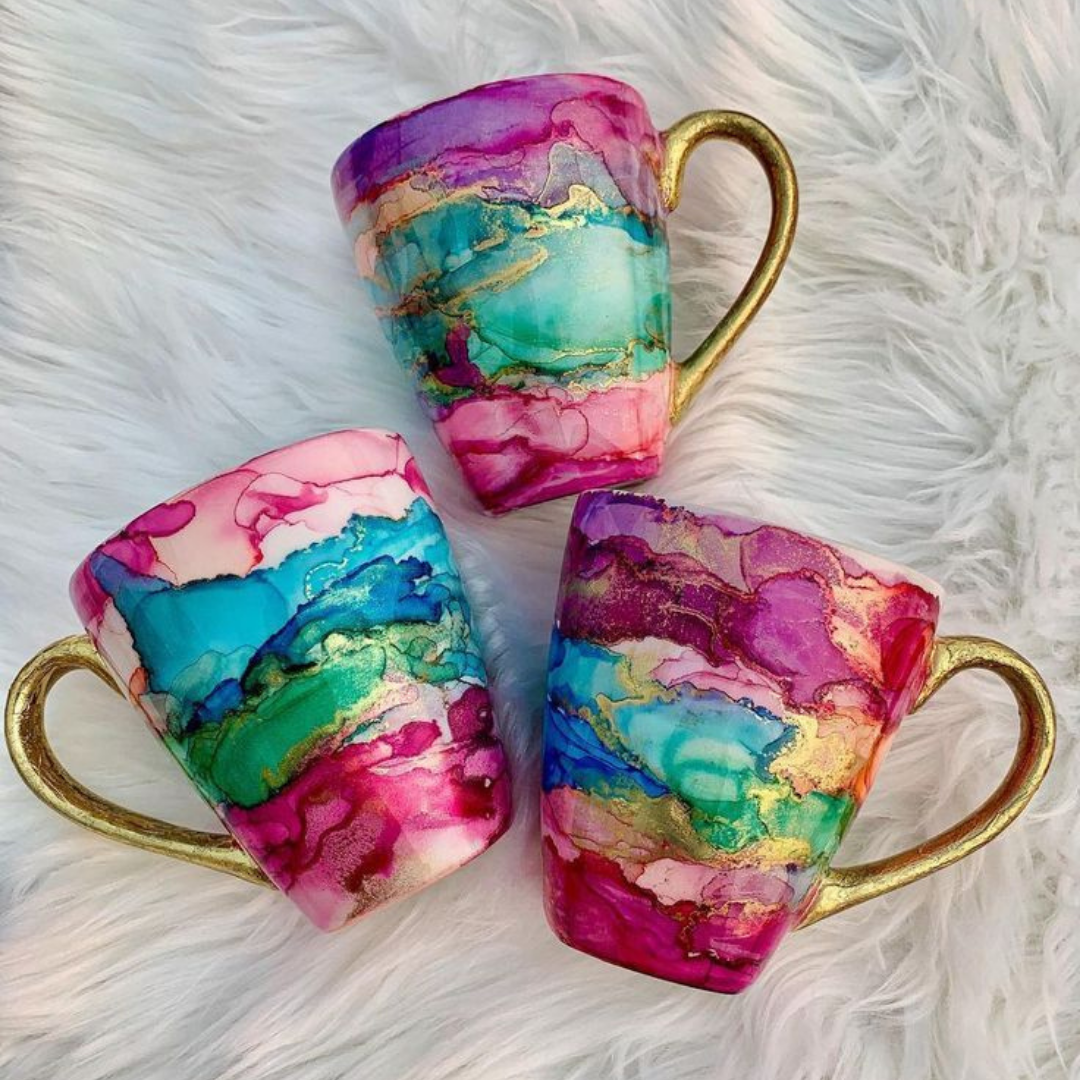 ✅Aprenderás todos los pasos para realizar una taza y un termo con la técnica de tintas al alcohol.